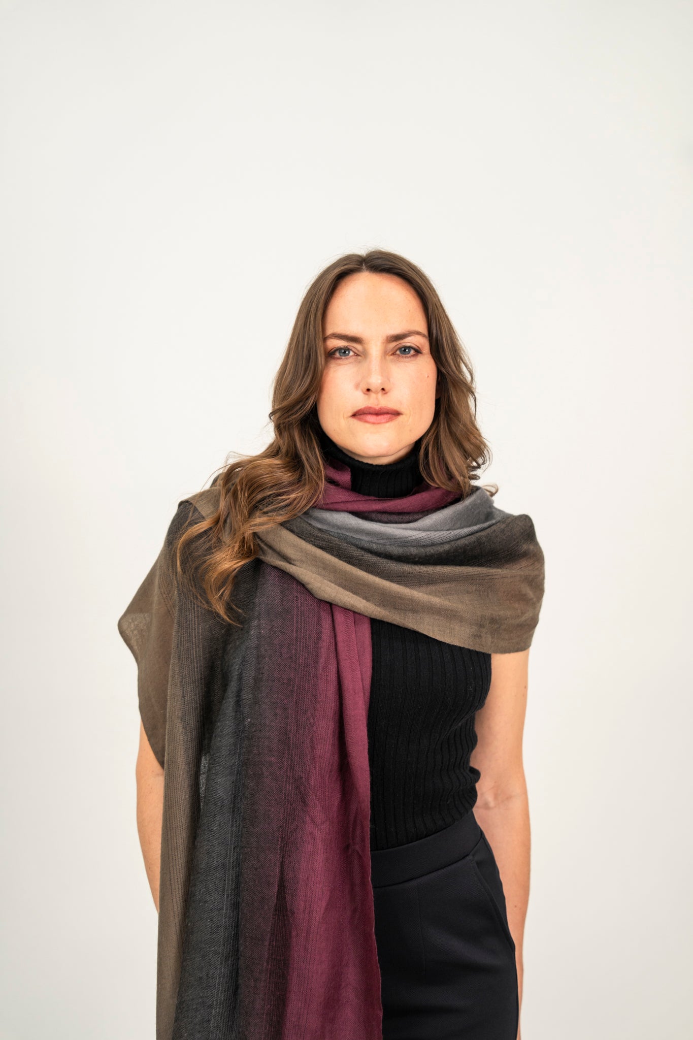 The Breeze Dusky Vineyard Ombré, ein Verlauf mit Aubergine, Olive, Grey – Handgefertigter Pashmina Schal